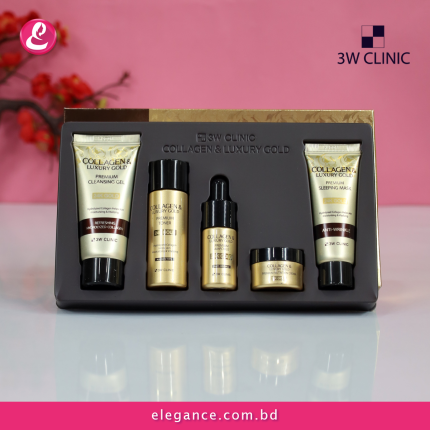 Revitalize impaired skin Protects against moisture loss and oxidative stress Promotes a natural, healthy glow in the skin Infused with 99.9% Pure Gold Extract to calm irritated skin Functions as an anti-aging solution, combatting wrinkles, fine lines, and visible signs of aging Boosts skin hydration, enhancing firmness Addresses rough skin conditions and brightens skin tone Eliminates dead skin and excess residue Maintains a balanced facial oil secretion Naturally penetrates the skin layers without any harmful chemicals Suitable for all skin types, including hypersensitive skin 1. Collagen & Luxury Gold Premium Cleansing Gel (1 pcs) (30ml) 2. Collagen & Luxury Gold Premium Toner (1 pcs) (30ml) 3. Collagen & Luxury Gold Premium Nutrition Cream (1 pcs) (10gm) 4. Collagen & Luxury Gold Premium Ampoule (1 pcs) (10ml) 5. Collagen & Luxury Gold Premium Sleeping Mask (1 pcs) (20ml) Country of Origin: South Korea.